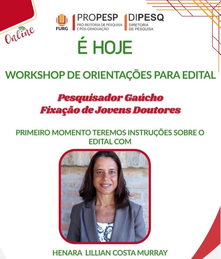 A professora Henara Lillian Costa Murray, da Escola de Engenharia da FURG, participou nesta segunda-feira do Workshop de Orientações para o Edital FAPERGS 06/2025 – Pesquisador Gaúcho e Fixação de Jovens Doutores, promovido pela Pró-Reitoria de Pesquisa e Pós-Graduação (PROPESP) em parceria com a Diretoria de Pesquisa (DIPESQ).