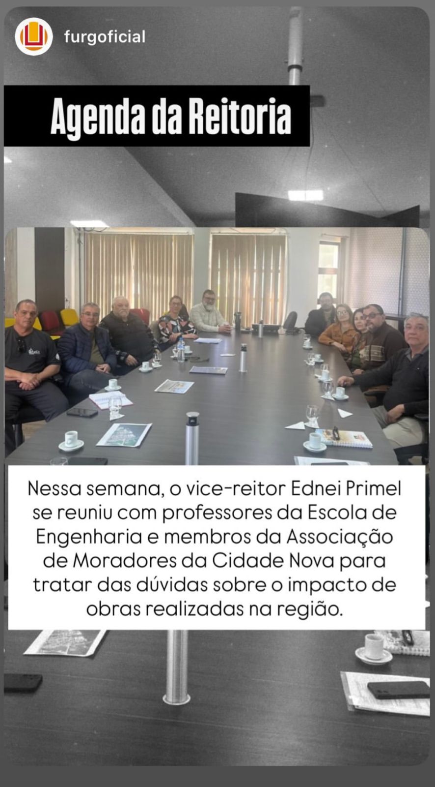Nesta semana, o vice-reitor da FURG, professor Ednei Primel, esteve reunido com servidores da Escola de Engenharia e representantes da Associação de Moradores da Cidade Nova. O encontro teve como objetivo dialogar sobre dúvidas e preocupações relacionadas ao impacto das obras em andamento na região.
