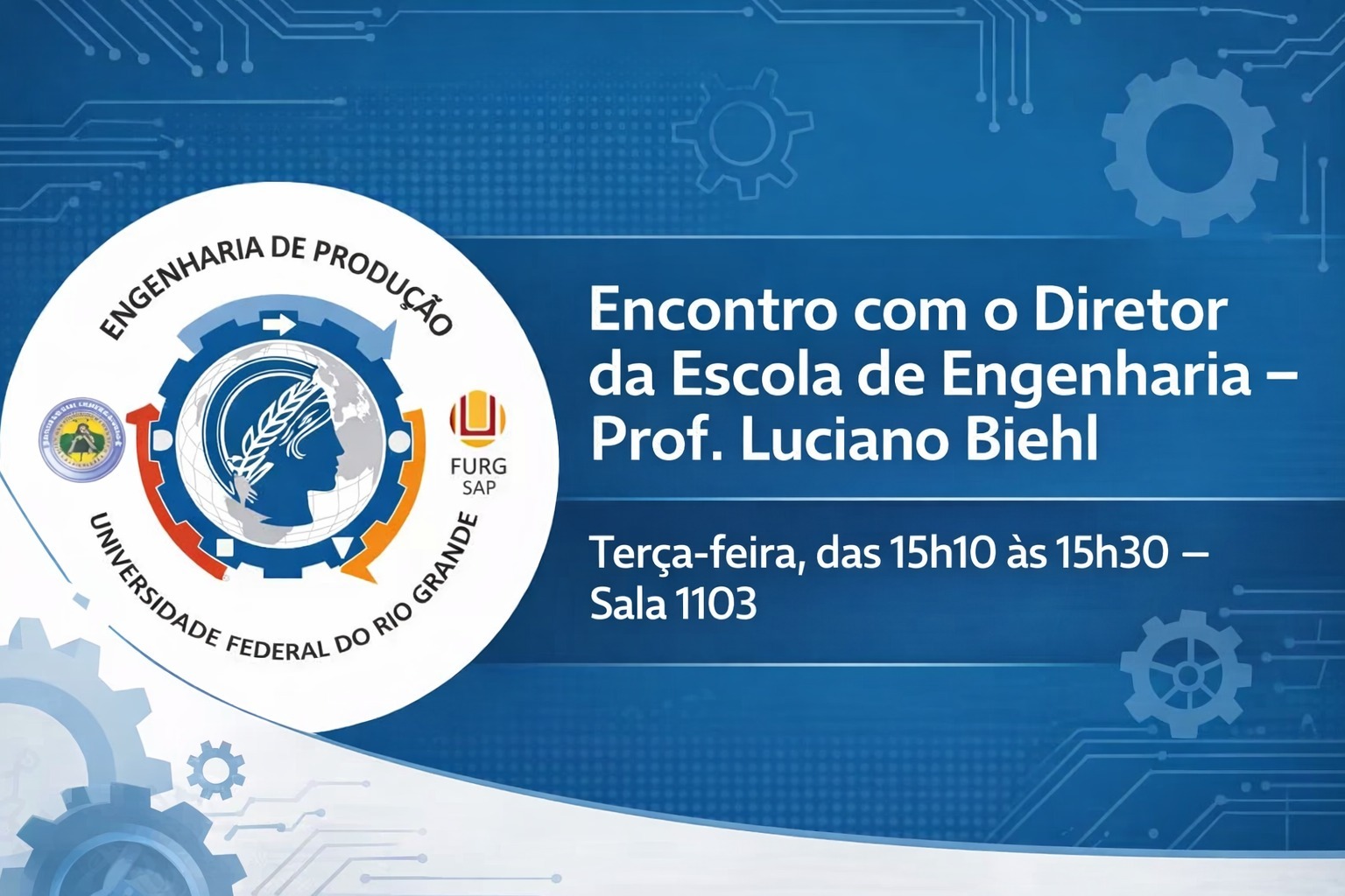 A Direção da Escola de Engenharia realizará, na próxima terça-feira à tarde, 17 de março de 2026, um encontro com a comunidade acadêmica do curso de Engenharia de Produção (SAP), com o objetivo de promover diálogo, escuta e alinhamento sobre as atividades acadêmicas e institucionais do curso.